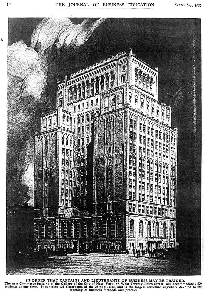 The impressive new building of the School of Business and Civic Administration received much favorable attention. It was noted in the caption of this picture that it "is the largest structure anywhere devoted to the teaching of business methods and practice." [Source: Baruch College Archives. The Journal of Business Education, Volume 2, Number 6 (September 1929): 14.]