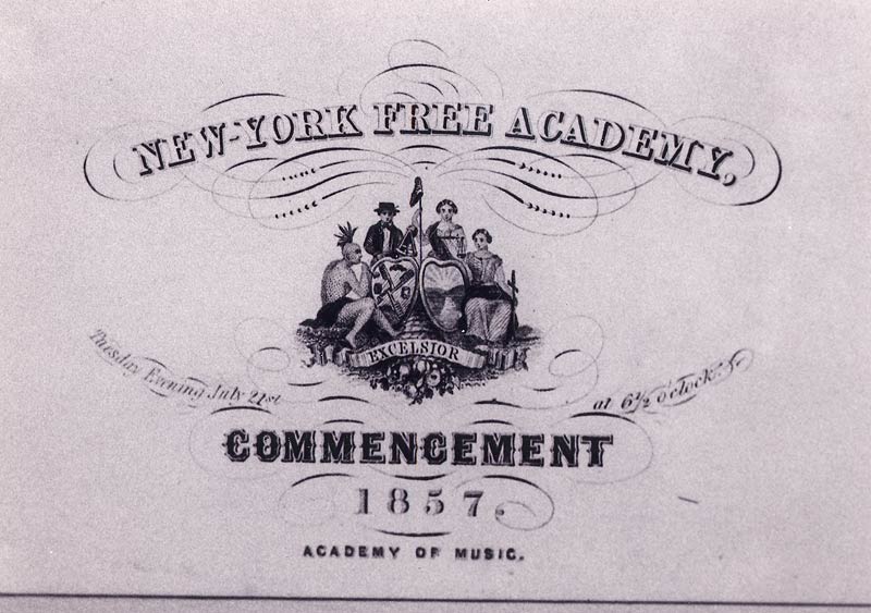 The early graduating classes were small, but there were still too many guests attending the commencement to fit into the chapel at 17 Lexington Avenue. At first Niblos Garden on Broadway and Prince Street was used for the ceremony, but after 1854 the Academy of Music on the northeast corner of 14th Street and Irving Place took its place. Graduates, parents and guests at the early commencements heard orations from the graduates, and listened to musical selections. When the Academy of Music closed in 1886, commencements were moved to Carnegie Hall where they remained until 1908. [Source: City College Archives.]