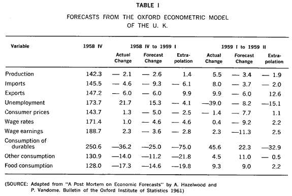 Table I shows two sets of forecasts from the Oxford model for quarters outside the period to which the model was fitted.