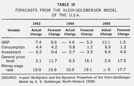 November 1953; and, similarly, that for 1955 was prepared in November 1954, but with the use as well of such independent information as surveys of investment plans. It is interesting to note that the model correctly forecast the down-turn in GNP in 1954, and also a rather subtle development, a slight rise in consumption in that year. It also forecast an upturn in 1955, but seriously under-estimated the extent of that up-turn. However, the last two lines of the table show the money side of the model to be deficient. Price movements are consistently over-estimated, and so is the wage change in two of the three years. Further detailed work by Goldberger in his excellent book on Impact Multipliers showed that the investment function was one of the weakest relations in the model and that the errors in forecasting GNP were highly correlated with errors in forecasting investment. He concluded: