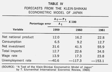 "Only 4 out of 18 variables have an absolute error of less than 10 percent and only 7 have an absolute error of less than 20 percent in all 3 years. The worst projections, with an absolute error of more than 30 percent in each year are those for investment and unemployment. In 54 projections, 43 have lower values than the actual ones, indicating the under-estimating characteristic of the model." These projections are based on the true values of the predetermined variables, so that they are a direct indication of errors in the structure of the mode.
