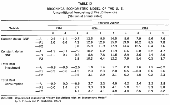 Table IX relates to an entirely different exercise. The Brookings Model of the U.S.A. differs from all previous macro-econometric models in several important respects. The first is size-400 or so equations rather than 20, 30, or 40. The second is in a method of construction. It utilizes an intellectual division of labor, with specialists working on the equations for various sectors rather than a single master-mind specifying the whole structure. The third feature is a consequence of the first two, namely much greater disaggregation. This is especially true of the investment and money sectors of the model. The fourth feature is a much more systematic attempt to get a good specification of the wage-price nexus and of the integration of real and money flows in the economy. The fifth is the integration of input-output analysis into the system.