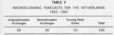 Theil has carried out a very comprehensive analysis of the forecasting record of the Dutch model for 21 basic variables for the 10- period, 1953-1962. Table V shows that the models had a bias towards under-estimation of actual changes. Of the turning point