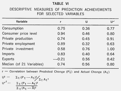 Table VI shows some descriptive measures for selected variables. The letter r denotes the correlation between predicted change and actual change, and remembering that we are dealing with changes and not levels, we observe that most of the r's are quite good. There is, however, a fairly low correlation between predicted change and actual change for investment, and a negative one for exports. The meaning of the U coefficients may be seen as follows: