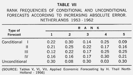 have been used. The various conditional forecasts (i) to (iv) depend on whether the wage rate and/or exports have been taken to be endogenous or exogenous. In (i), both have been taken as exogenous and in (iv) both are endogenous. We then have five forecasts for any variable for any year. These can be ranked from 1 to 5 by comparison with the actual change. Table VII shows the frequencies of those ranks. The unconditional forecasts occupy the worst position (fifth rank) more often than any other kind of forecast. However, the unconditional forecasts also have the greatest frequency in the first rank. Theil attributes this result to the forecaster's applying "amendments to the outcomes of the model computations in the light of extraneous information or common sense"-the Dutch, version of the flexible Michigan use of econometric models.