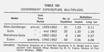 Table VIII is inserted as an interesting curiosity obtained from a recent article, as it is not often that people make direct comparisons of various econometric models for the same economy. This comparison focuses on the government expenditure multiplier only. The models differ in size (that is in the number of equations), specification, sample-time period, and basic unit-time period (annual or quarterly). The multiplier values come out fairly close for the annual models, but they are much higher for the quarterly model, though