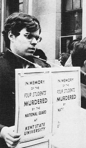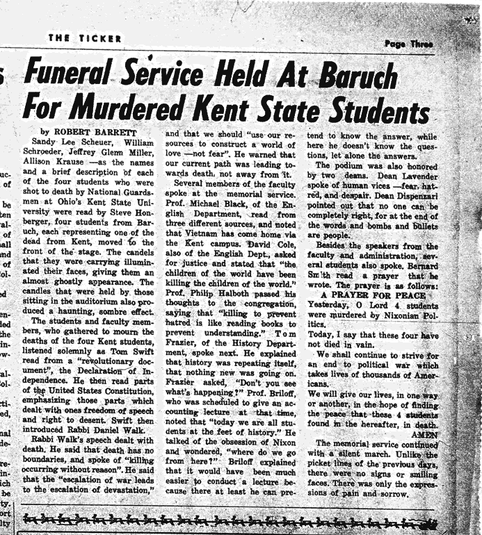 On May 6, 1970 a memorial service was organized at Baruch College for the students of Kent State. Students, faculty, and administration participated. The service itself lasted an hour and a half. Every seat was taken and people were standing up and lining the aisles. Following the service, there was a silent march outside the college's main building at Lexington Avenue and 23rd Street. [Source: Baruch College Archives.]
