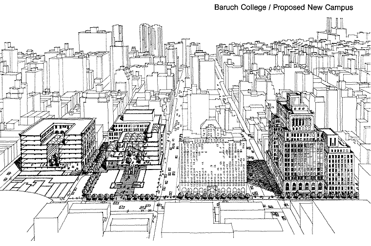 The road to a new campus for Baruch College was a long one, but under the leadership of President Joel Segall it appeared that this would finally become a reality. The plan envisioned Site A, the Lexington Avenue building and Site B a facility between 24th and 25th streets off Lexington Avenue. [Source: Baruch College Archives.]